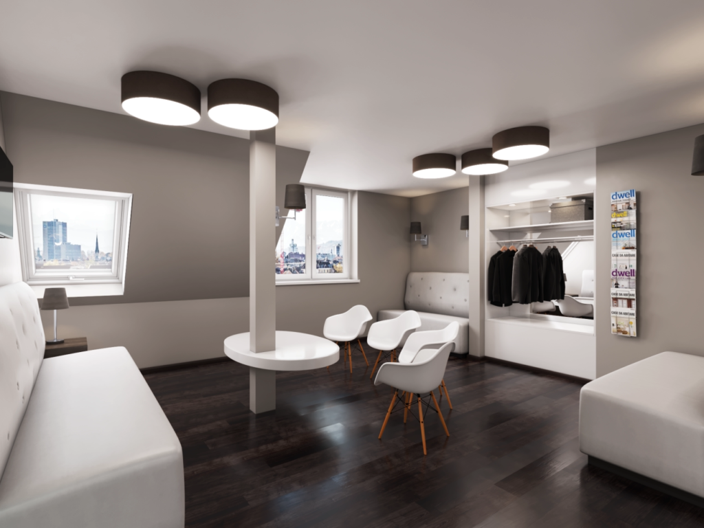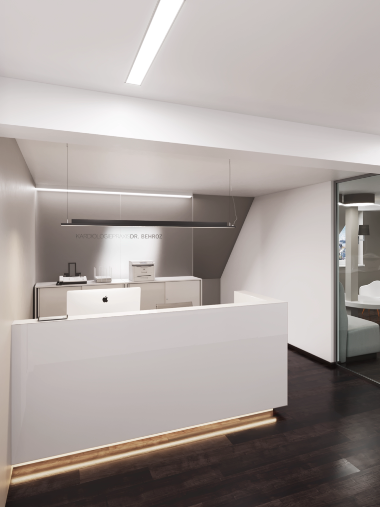 Das Airport Medical Center im Flughafen Stuttgart beauftragte uns mit der Planung neuer Räumlichkeiten, die man im Flughafen beziehen wollte. Zunächst sollte ein Grundriss mit Raumkonzept erstellt und im Vorfeld die Machbarkeit des Vorhabens geprüft werden. Bei der Planung der neuen AMC (Airport Medical Center) Räume im Flughafen Stuttgart mussten komplexe Anforderungen berücksichtigt werden, die über die Standards hinausgehen, wie spezielle Labor- & Oberflächenanforderungen, Brandschutz, Beleuchtung oder spezielle flughafenspezifische Sicherheitsaspekte. Es sollten auch vorhandene medizinische Geräte sowie Teile der Bestandsmöblierung aus der alten Praxis in das neue Raumkonzept integriert werden. Am Empfang wurden optisch störende aber konstruktiv notwendige Stützen in die Gestaltung mit einbezogen, durchdachte Raumanordnungen und -größen sollten für einen reibungslosen Ablauf im Praxisalltag sorgen. Die Visualisierung (siehe Fotos) vermittelten unserem Auftraggeber schon vor der Realisierung einen fotorealistischen Eindruck unserer Planung inkl. Material- & Farbkonzept, wie dem prominenten Empfangsbereich. Die hohen Kosten für eine nötige Dachsanierung (Brandschutz) waren der Grund, warum das Projekt schließlich nicht realisiert wurde.