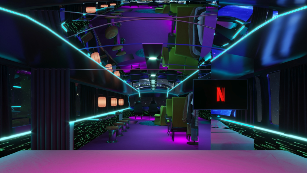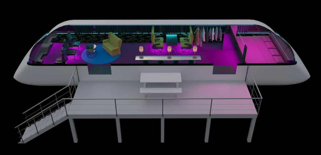 Äußerlich erhielten wir den Transrapid im Originalzustand, im Innern integrierten wir relevante Teile des Originalinterieur in das neue Raumkonzept im Cyberpunk-Stil.
